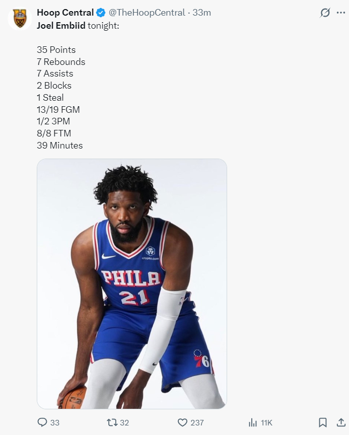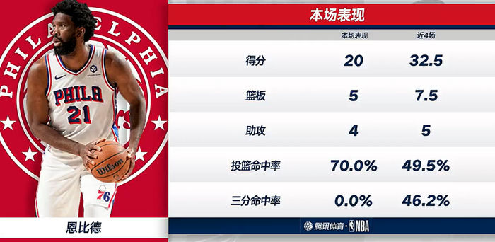 恩比德在第三节再度化身表演艺术家,超艾顿身上跳自己倒地还去要犯规,拉拉维亚不伸手他投篮抬肘击中拉拉维亚胸口裁判给2+1,恩比德表演后两个中投命中完成30+,三节28分钟,恩比德15中11+三分1中1+罚球7中7拿到30分7篮板6助攻1抢断2盖帽。